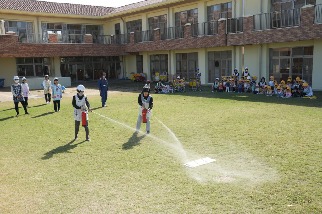 消火避難訓練のあと、水消火器を先生たちが実践で使わせてもらいました。