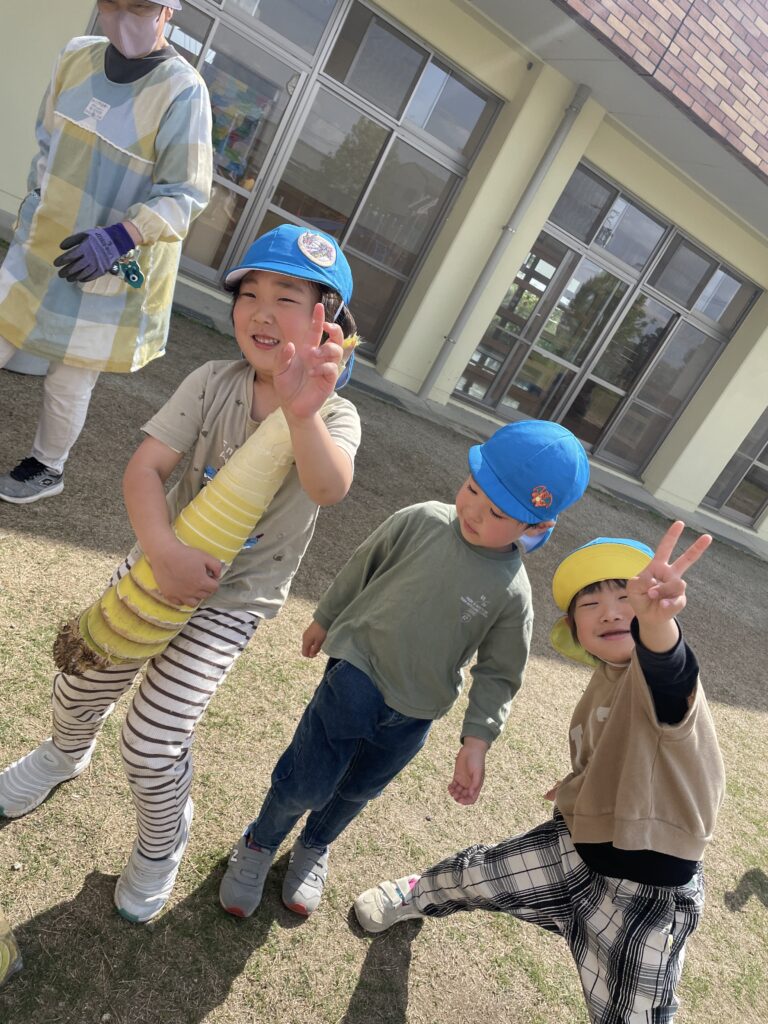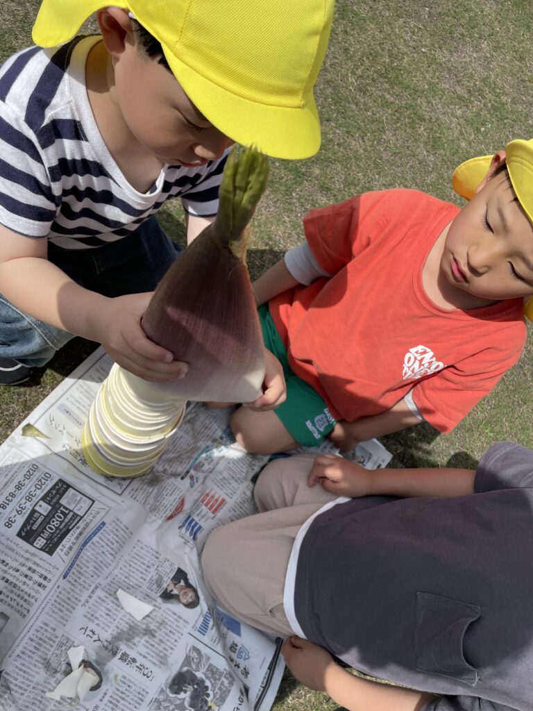 たけのこの皮むきをしながらどんどん黄色の部分が見えたときに「早く食べたい!」と楽しみに剥いてくれました。明日の午後のおやつにたけのこのおにぎりで食べたいと思います!!