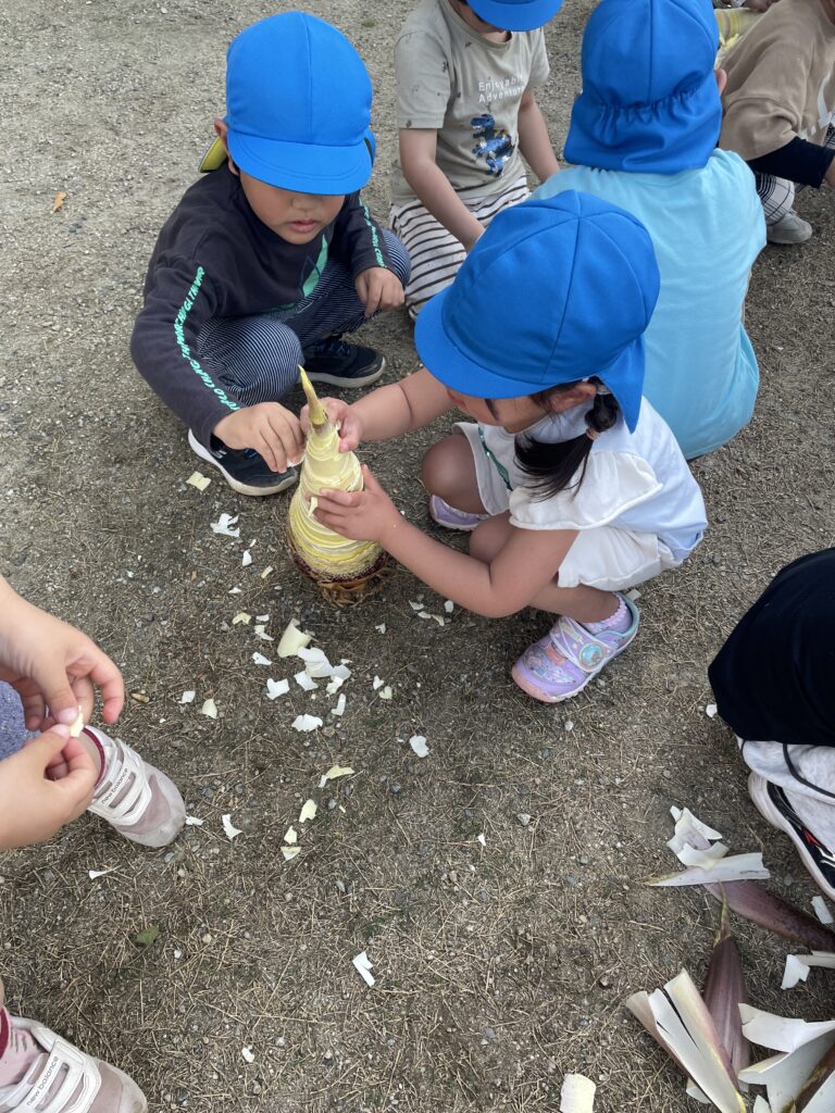 今年はたけのこをきよこ先生がたくさん取ってきてくれたので、黄組・青組さんで皮むきをしました。